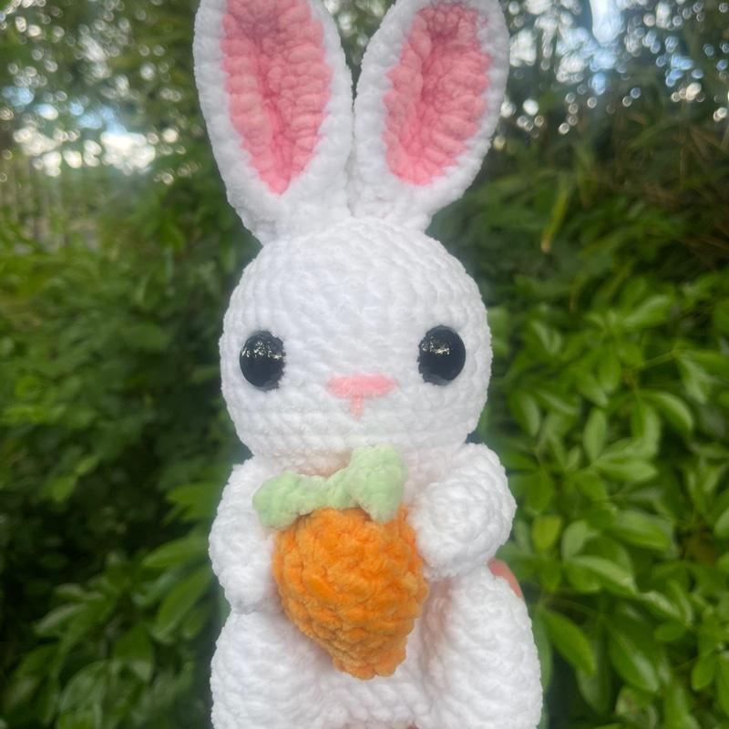 * Product Overview: This product features a charming crochet bunny accompanied by a carrot. It's a simple yet delightful design perfect for adding a touch of whimsy to your collection. The crochet bunny and carrot together create a cute, cohesive image.